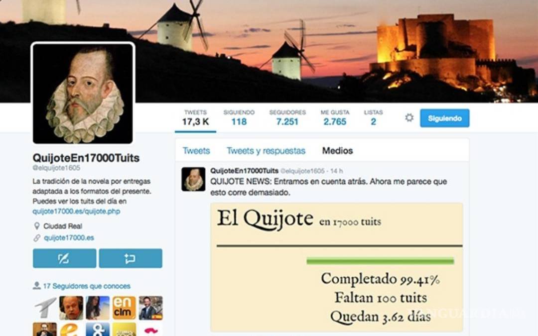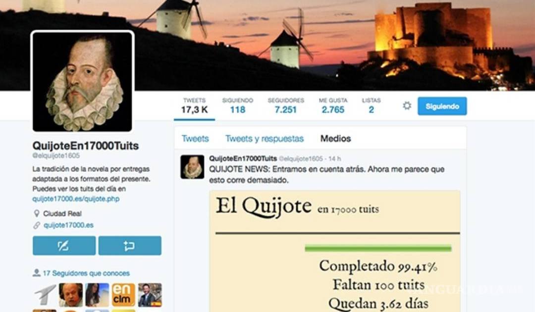 Con motivo del cuarto centenario del fallecimiento de Miguel de Cervantes, la ingeniosa aventura del informático español Diego Buendía de escribir los más de dos millones de caracteres de El Quijote en 17,000 tuits llega a su fin.