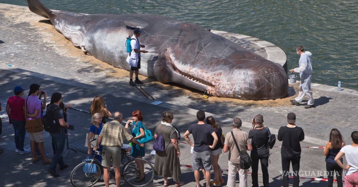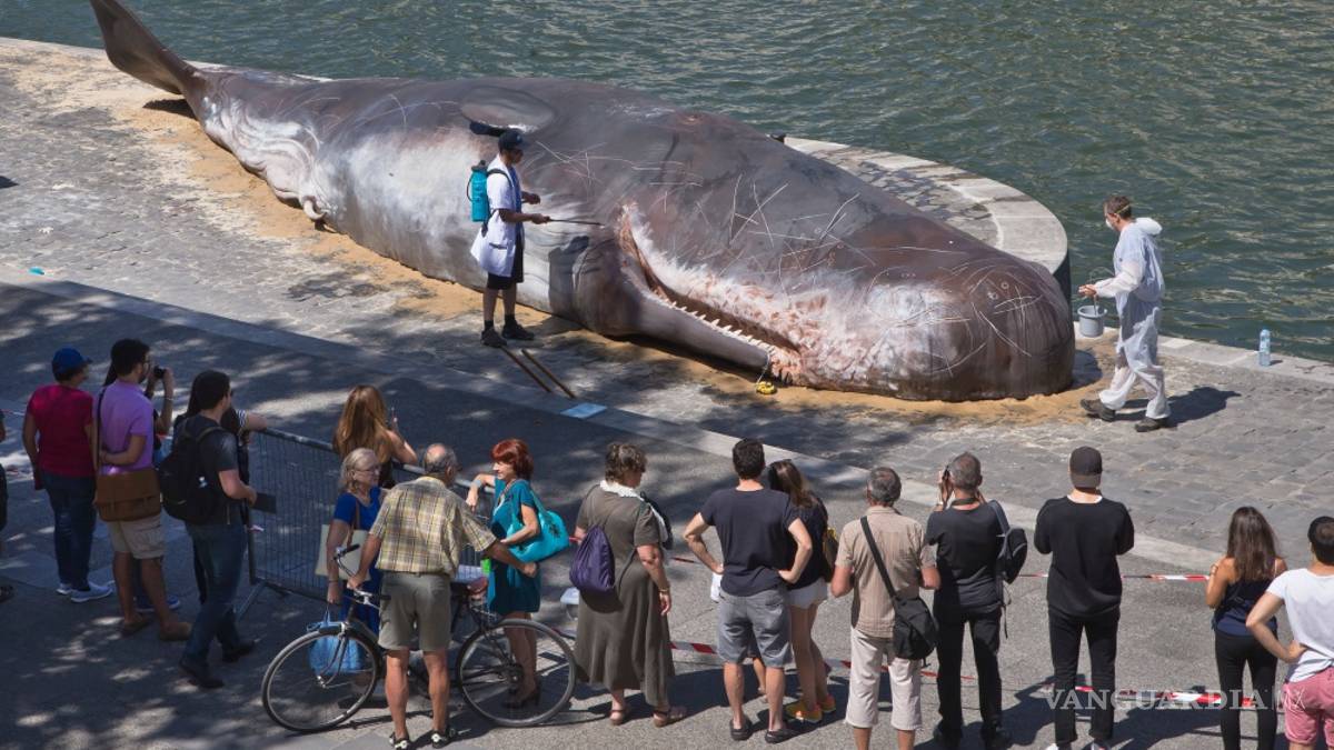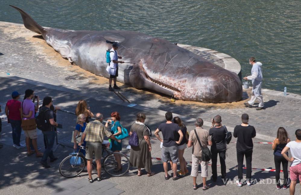 El cuerpo sin vida de un "cachalote" apareció hoy en París, en el borde del río Sena y a pocos metros de la catedral de Notre Dame, encallado por un colectivo de artistas que con esa escultura hiperrealista quisieron concienciar sobre el cambio climático y la pesca intensiva.