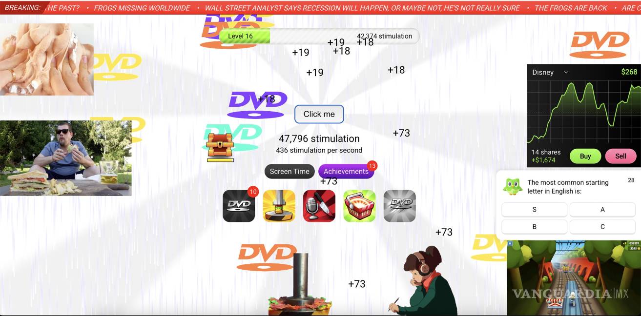 Aunque el “brain rot” puede referirse al daño, como la forma en que la adicción a las pantallas puede mermar la capacidad de atención, su significado también puede ser humorístico y divertido, como las imágenes y ediciones megadistorsionadas. Un nuevo videojuego de navegador, “Stimulation Clicker”, convierten el “brain rot” en un pasatiempo alegre mientras al mismo tiempo satiriza lo horrible que puede sentirse engullir la web.