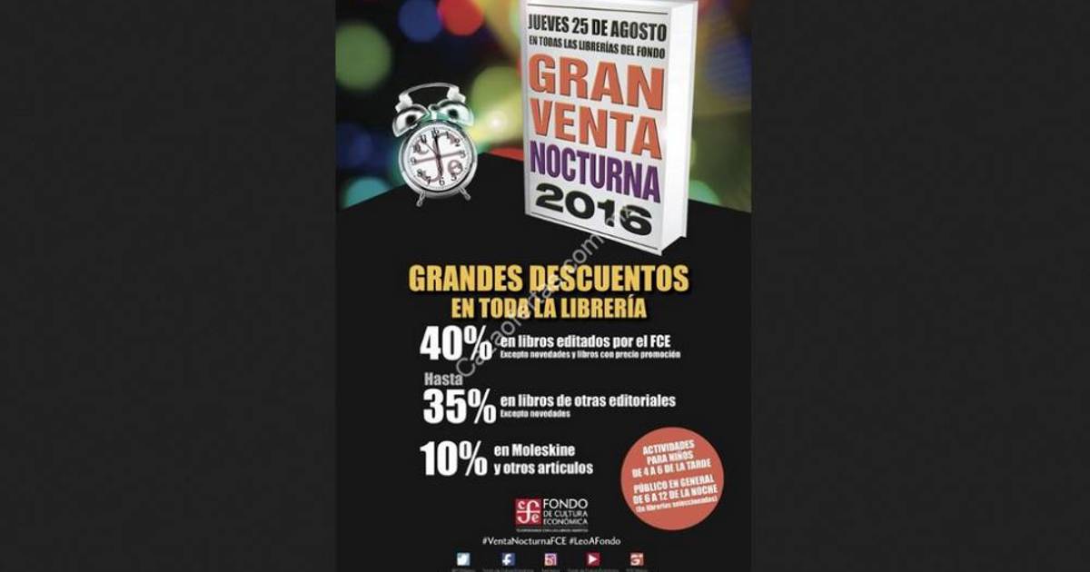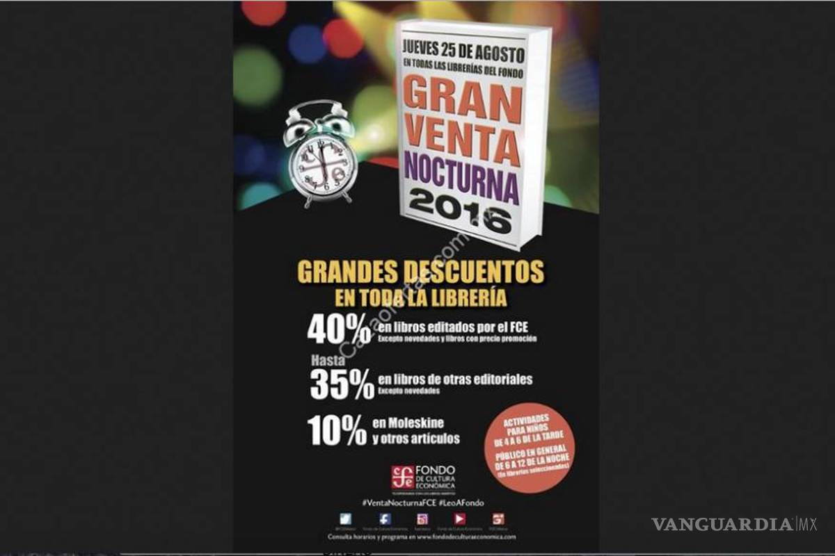 El Fondo de Cultura Económica (FCE) agasajará a los lectores con su tradicional Venta Nocturna, que se llevará a cabo el próximo jueves 25 de agosto en su red de librerías y la cual contara con la presencia de reconocidos autores.