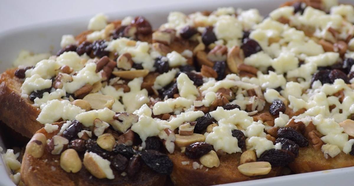 Luego, coloca una capa de pan en un recipiente. Agrega queso, cacahuate tostado, pasas y jarabe de piloncillo. Repite los pasos para una segunda capa de tu postre. Al final, sirve coco rallado para adornar tu platillo.