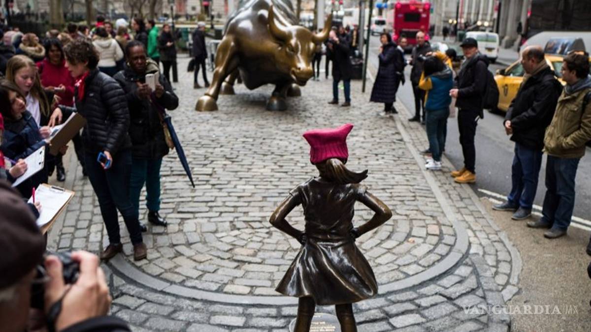 Nueva York.- Con los brazos en jarra y la coleta al viento, una niña menuda mira desafiante desde el martes al imponente toro de Wall Street en Nueva York, un mastodonte de cara furiosa y tres toneladas de peso que simboliza el empuje del mayor mercado de capitales del mundo. El contraste entre una y otra figura de bronce ha brindado la que será una de las imágenes más poderosas del Día Internacional de la Mujer, en uno de los lugares, además, más fotografiados por turistas.
