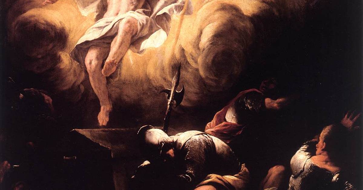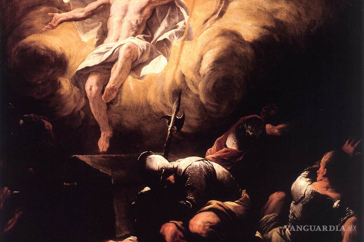 > Inspirada muy probablemente en una pieza de Caravaggio, destruida en 1805, esta escena que el pintor italiano del barroco tardío creó muestra a Jesús resucitado liberándose del sepulcro con la violencia característica del período, estandarte en mano, y alzándose hacia los cielos, probablemente en una combinación con el momento de su ascensión.