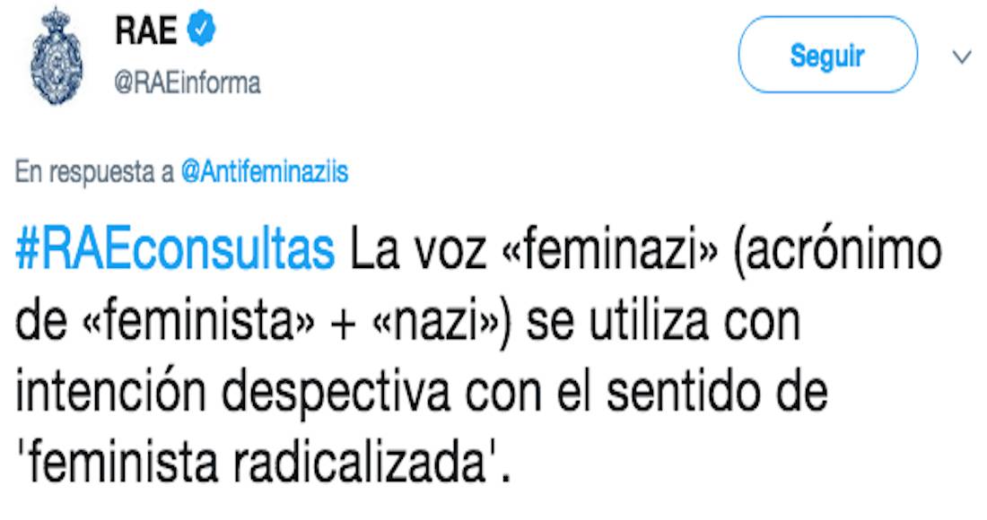 “La voz 'feminazi' (acrónimo de 'feminista' + 'nazi') se utiliza con intención despectiva con el sentido de ‘feminista radicalizada’”, es el mensaje de la Real Academia Española