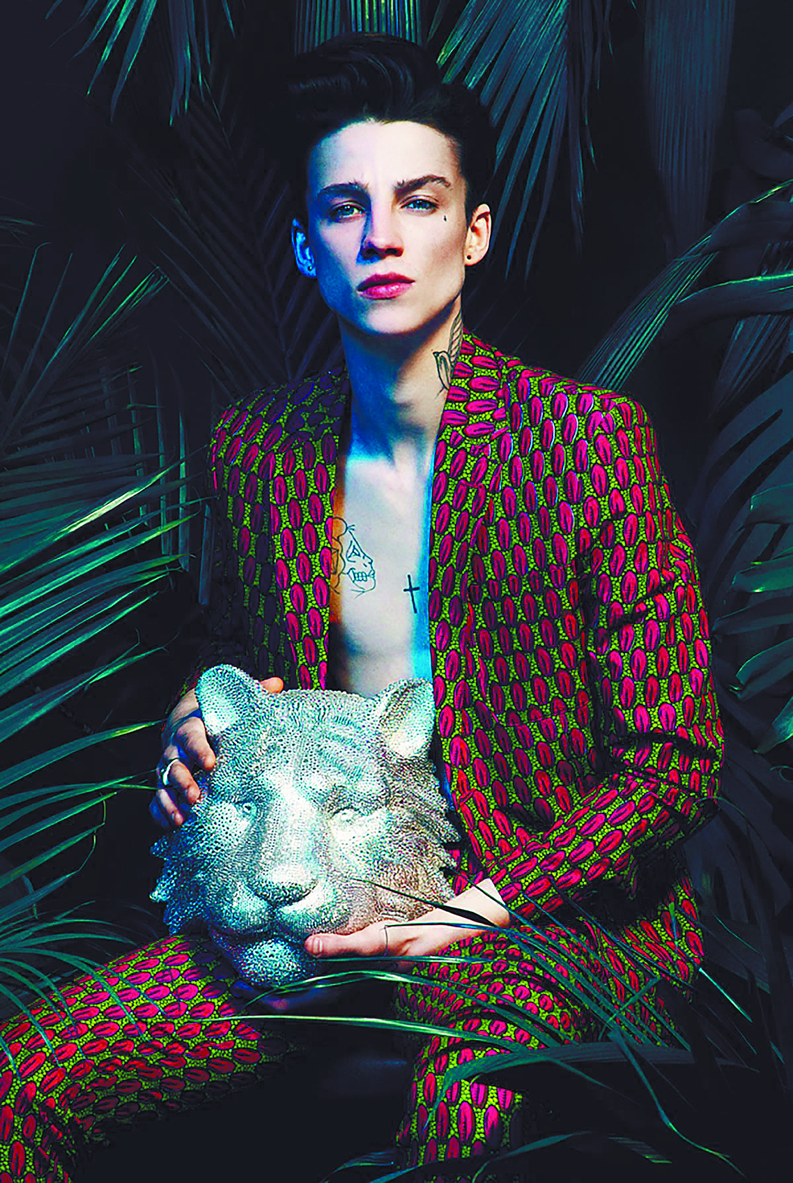 Gucci, firma de gran influencia en la moda actual, porpone un hombre con un estilo andrógino, excesivo y con brillo, en el que mezcla prendas masculinas y femeninas.