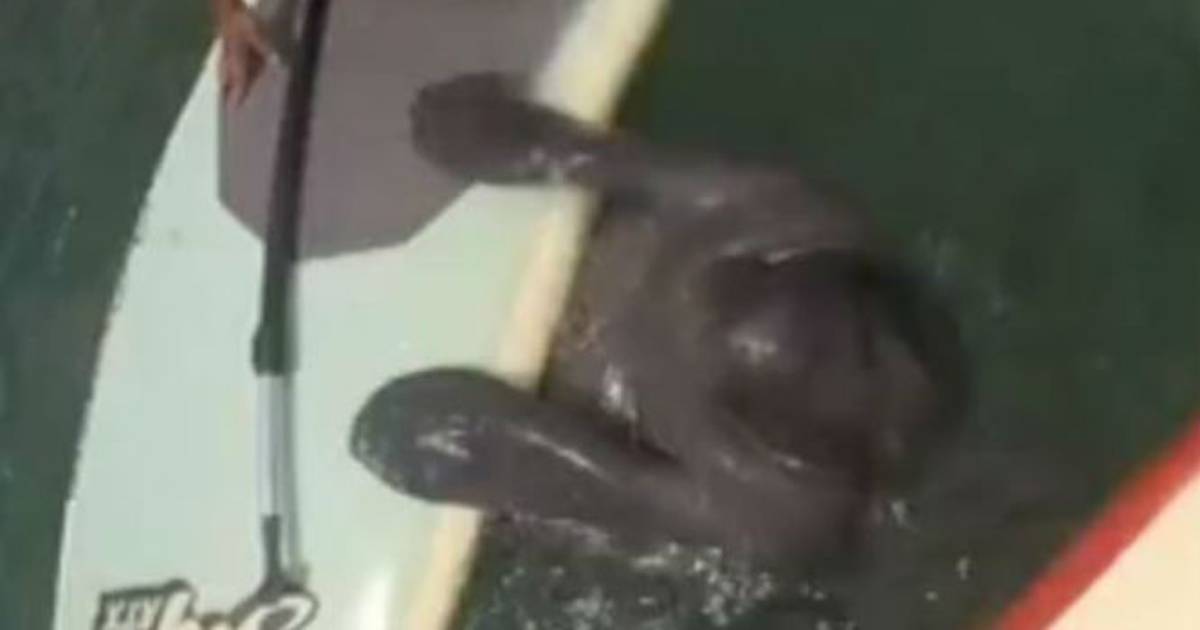 Un curioso manatí surgió del agua y se sujetó de su tabla