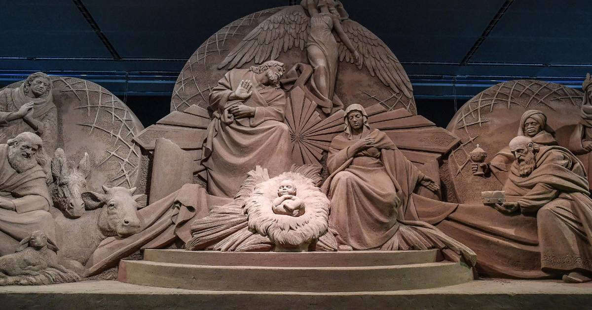 El nacimiento, realizado con 1,300 metros cúbicos de arena de la playa italiana de Jesolo, fue donado por el patriarcado de Venecia y la ciudad de Jesolo y fue esculpido durante semanas por cuatro artistas.