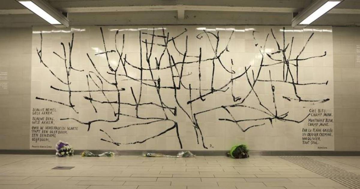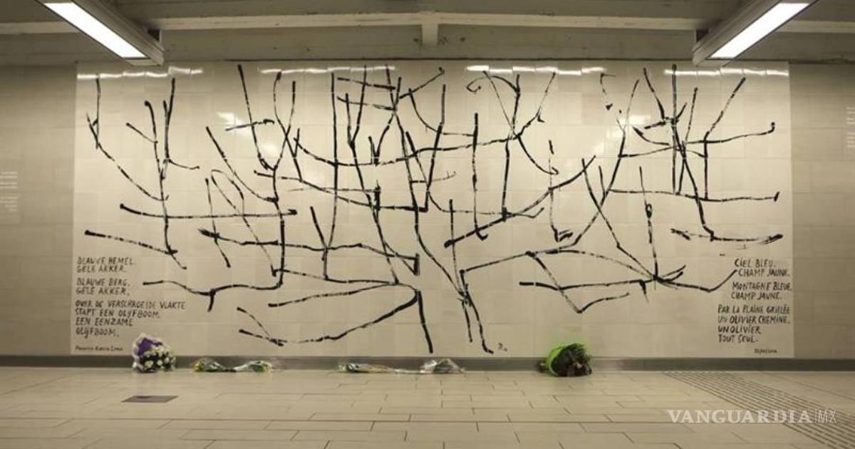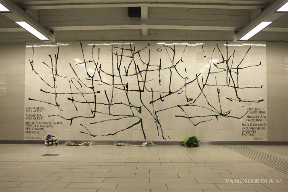 La obra, presentada hoy a los medios, reproduce un olivo en un espacio de 2,75 por 6,5 metros e incluye el poema de Federico García Lorca "Paisaje sin canción" en francés, neerlandés alemán, español, inglés, árabe, ruso y chino, informó hoy la agencia belga.