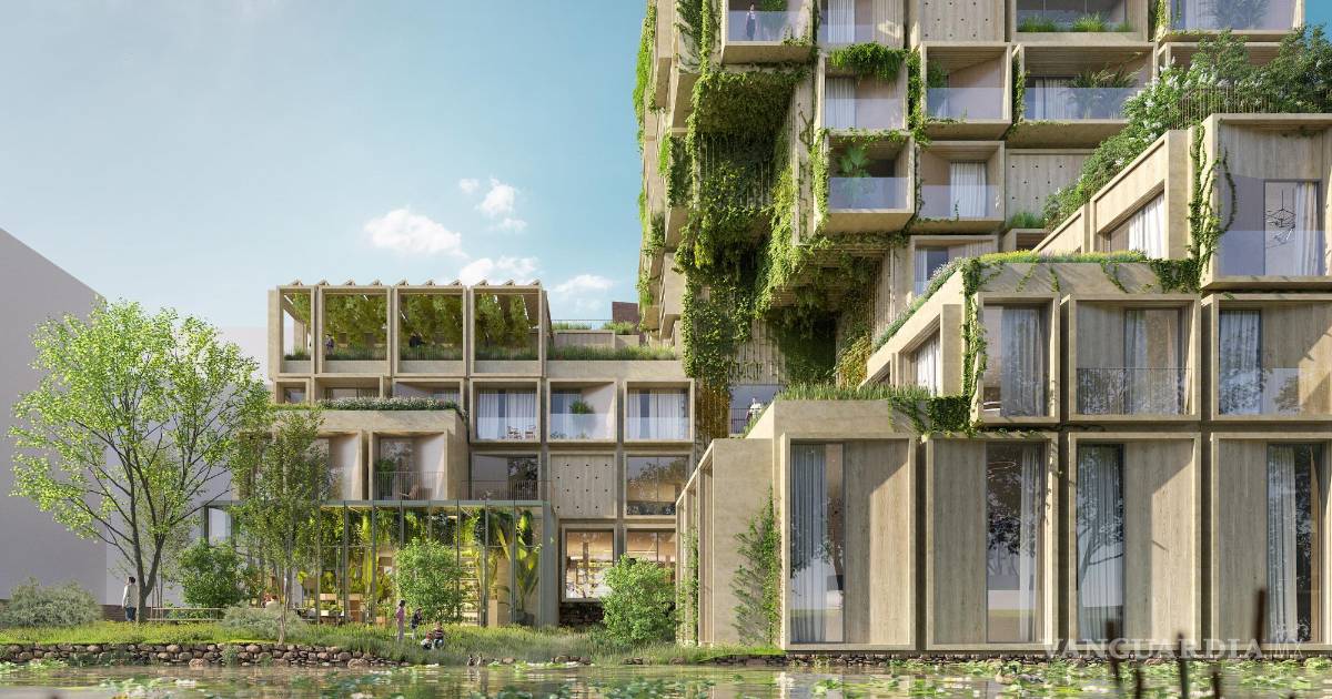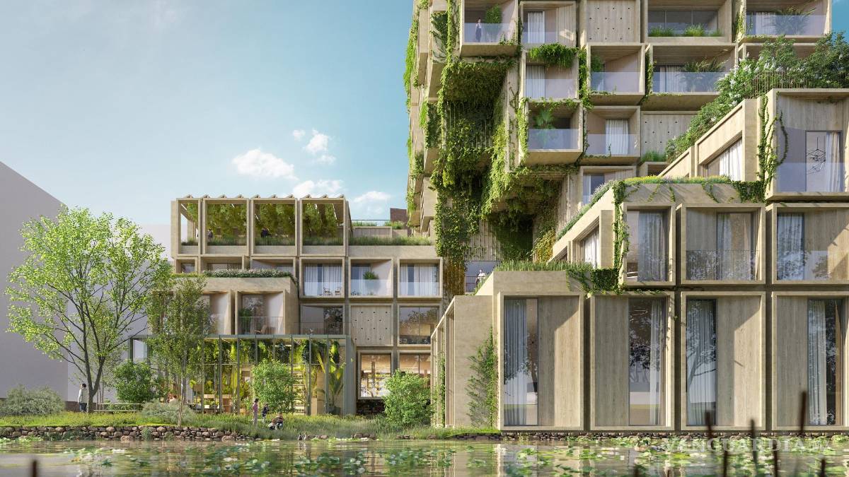En este complejo residencial y comercial coexistirán “un íntimo mundo interior” verde-azul en las aguas de dentro del edificio, con unos muelles hechos de materiales naturales con aberturas, helechos y hierbas, y una fachada en voladizo con vegetación.