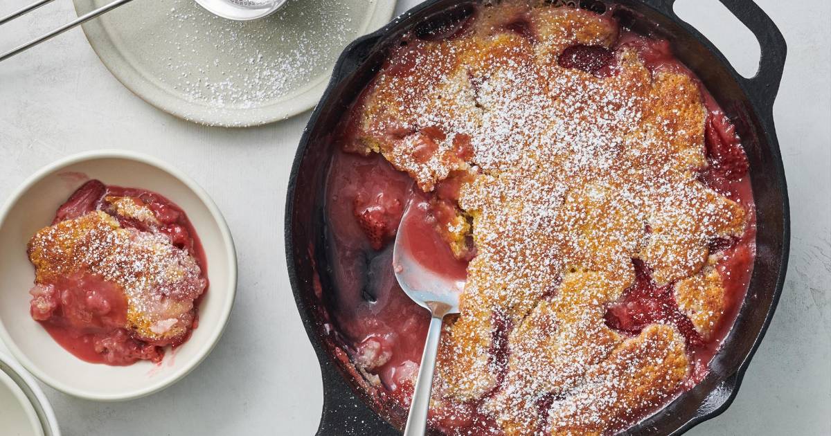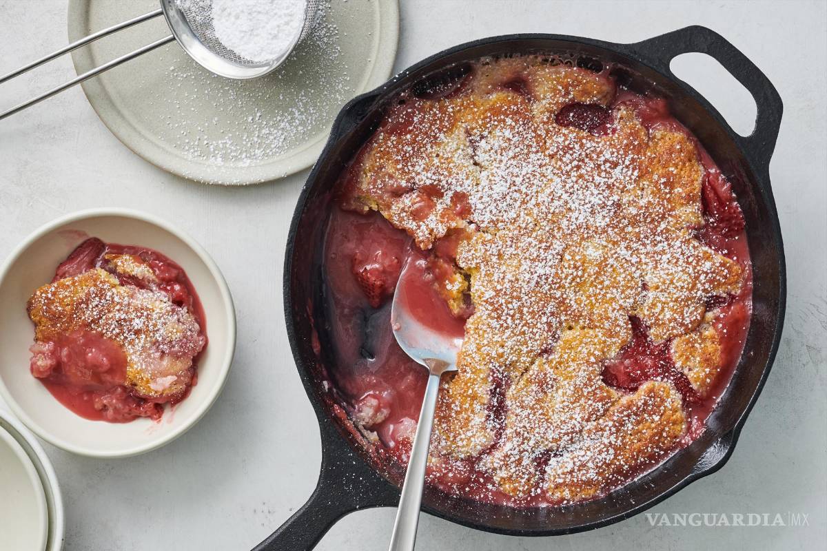 5. Hornee en la rejilla del medio del horno hasta que el pastel esté dorado y se haya formado una salsa tibia parecida a un pudín debajo de las fresas, de 25 a 27 minutos.