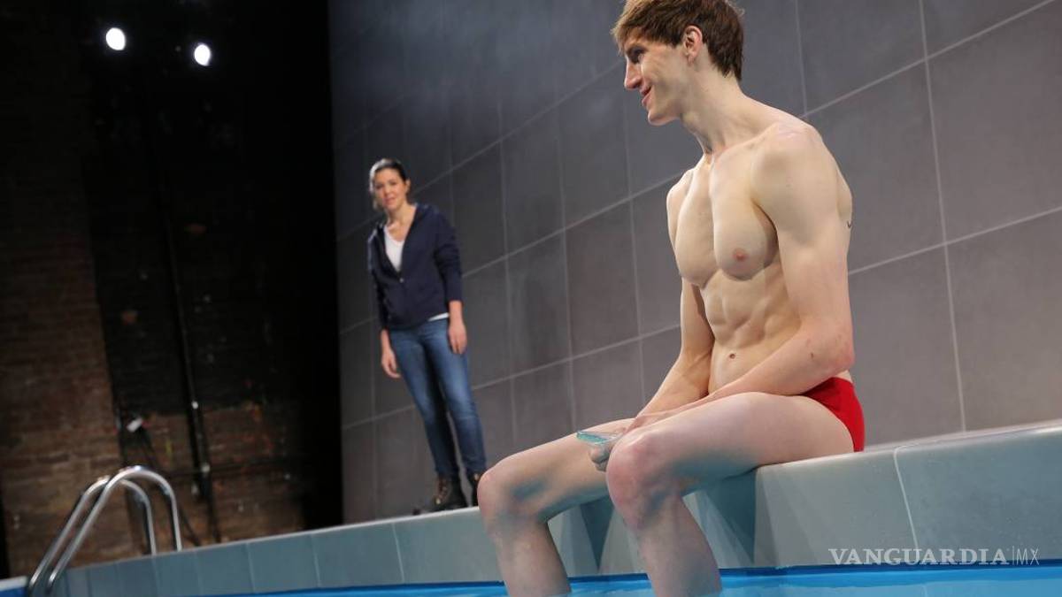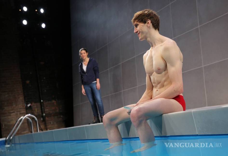 La piscina elevada ocupa el largo del escenario y sus paneles de vidrio permiten que el público vea a los actores nadando, como si se tratara de un acuario de tamaño olímpico. Acero y vidrio sostienen miles de galones de agua.