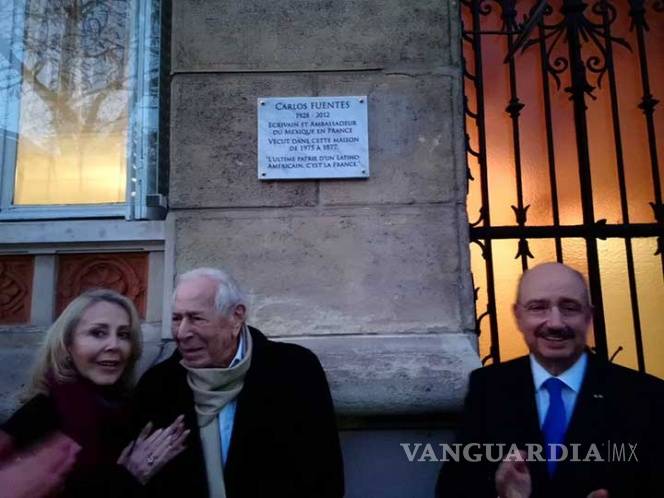 "Carlos Fuentes 1928-2012. Escritor y Embajador de México en Francia, vivió en esta casa entre 1975 y 1977. La última patria de un latinoamericano es Francia”, es el texto inscrito en la placa, colocada en la entrada de la residencia del embajador, en el número 20 de la avenida del presidente Wilson de la Ciudad Luz, la placa lleva inscrito.