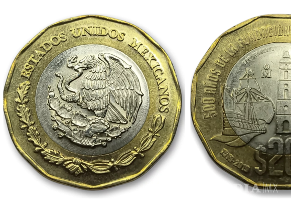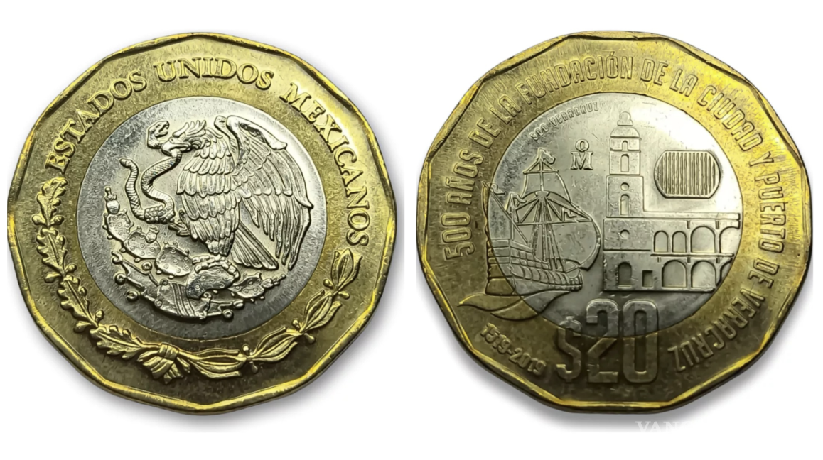 Se trata de la moneda conmemorativa de 20 pesos por los 500 años de la Fundación de la Ciudad y Puerto de Veracruz. Fue puesta en circulación por el Banco de México el 22 de abril de 2020 y forma parte de la familia “C1”. Su diseño dodecagonal (12 lados) y detalles históricos la hacen única. Pesa 12.76 gramos y tiene un canto estriado discontinuo.