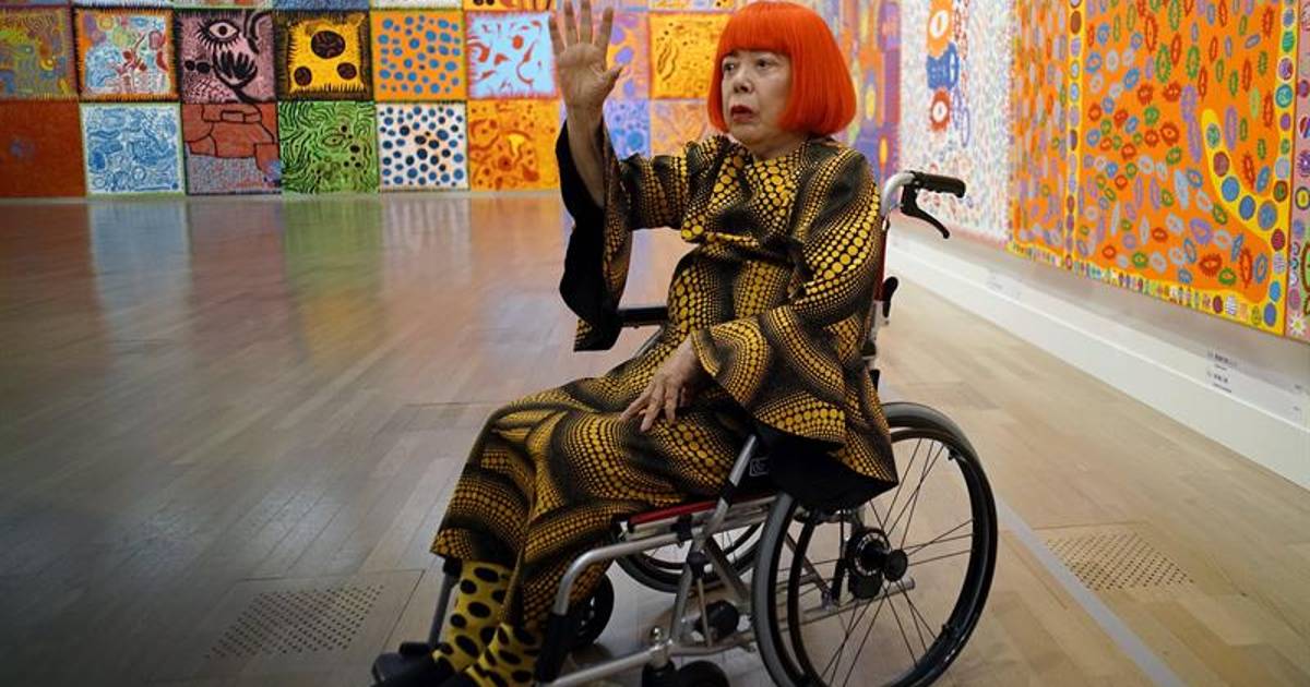 Kusama, de 87 años, apareció en este escenario ante un enjambre de periodistas expectantes durante la inauguración de la muestra, llevada en silla de ruedas y ataviada con una peluca rojo brillante y un vestido de lunares negros y amarillos, como si fuera una más de sus llamativas piezas.
