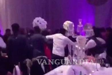 Se ve a los invitados tomándose a golpes de puño y amenazándose unos a otros con las sillas.