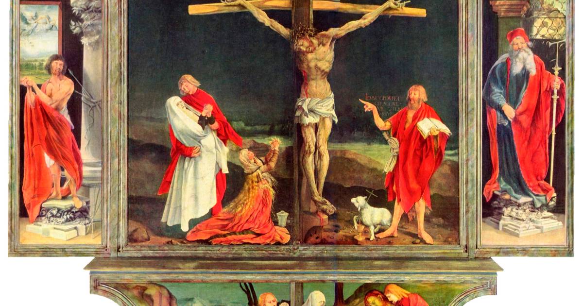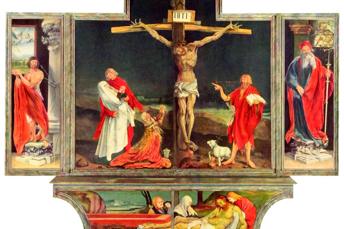 En el “Políptico –Retablo o Altar- de Isenheim” se representan no sólo uno de los temas más recurrentes en el arte religioso occidental –la Crucifixión de Jesús- sino otros más, como la Anunciación, la Virgen con el Niño y las Tentaciones de San Antonio. Se representa, además, a san Sebastián y a san Antonio Abad. De compleja estructuración, este retablo es triple, según se desplieguen sus secciones centrales o la inferior: la predela en que vemos el cadáver de Jesús, al lado de un sepulcro abierto, acompañado por san Juan Evangelista, la Virgen María y María Magdalena; no se trata precisamente del momento del Descendimiento de la Cruz –uno más de los grandes momentos y temas de la humanidad y del arte- sino de otro en el que Jesús ya ha sido bajado de su cruz y está a punto de ser sepultado.