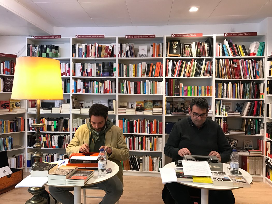 La que sí existe es esta: bilingüe (como mínimo) y con librerías cada vez más inquietas. Anna Maria Iglesia y Álvaro Colomer, con disfraz para la ocasión de agitadores culturales, han organizado cuatro duelos de parejas de escritores en las librerías Nollegiu y Malpaso. Duelos a máquina. Este es el primero. Se trata de dejar entre paréntesis las computadoras cotidianas y recuperar -porque todos los invitados son cuarentones- la mecanografía con que se iniciaron en la creación literaria.