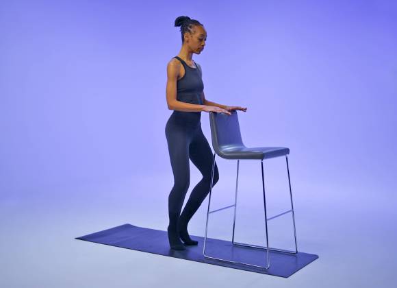 Colócate a un brazo de distancia de una silla, encimera u otro soporte, con las piernas juntas. Mientras te agarras al soporte, junta los talones y separa los dedos de los pies. Ahora levanta los talones unos centímetros del suelo. Dobla las rodillas, de modo que queden directamente sobre los pies en posición de plié. Contrae el tronco y baja el coxis unos centímetros.