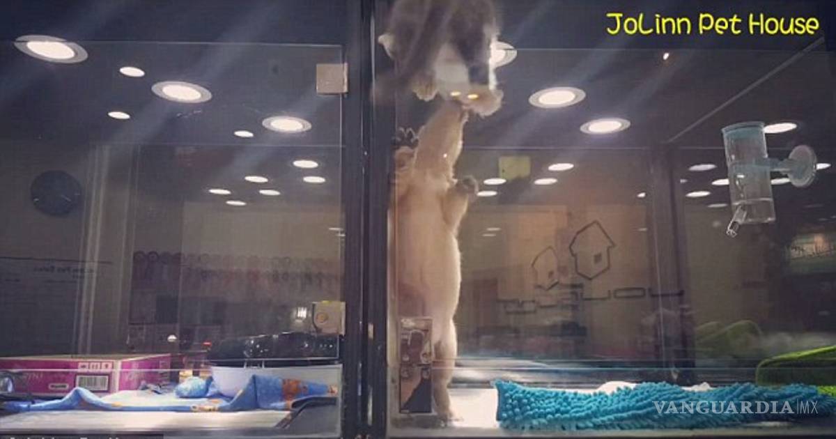 La grabación de más de un minuto de duración, muestra al pequeño minino y al cachorro dentro de un habitáculo ambos separados por una pared de cristal.