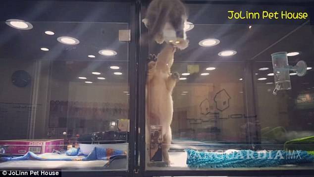 No se sabe si el gato trato de escapar de su vitrina o lo que realmente quería era reunirse con el cachorro