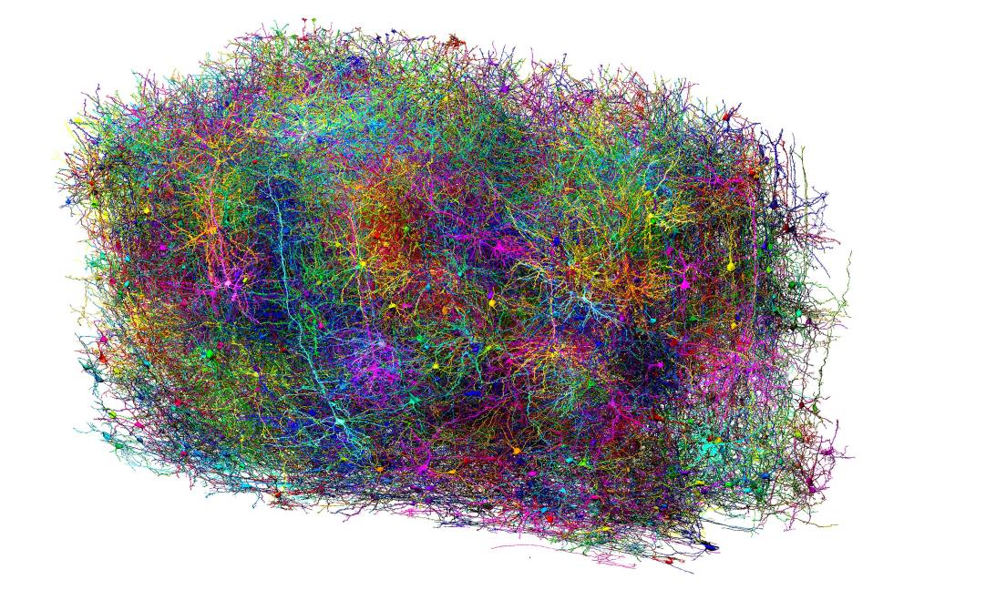 A continuación, los investigadores diseccionaron el cerebro del ratón y rociaron el milímetro cúbico con sustancias químicas endurecedoras. Luego cortaron 28.000 rebanadas del bloque de tejido, capturando una imagen de cada una. Los ordenadores fueron entrenados para reconocer los contornos de las células en cada corte y unir los cortes en formas tridimensionales. En total, el equipo registró 200.000 neuronas y otros tipos de células cerebrales, junto con 523 millones de conexiones neuronales.