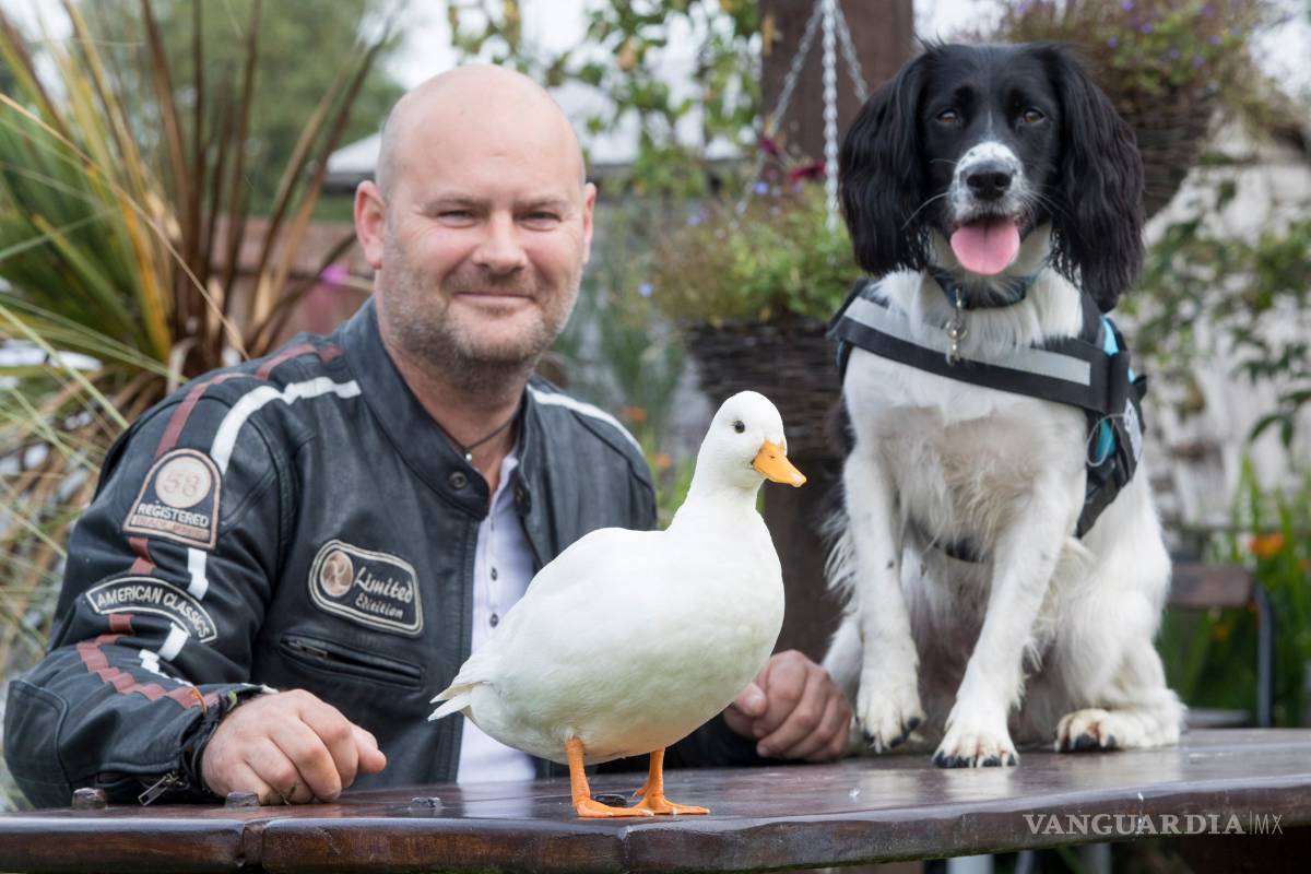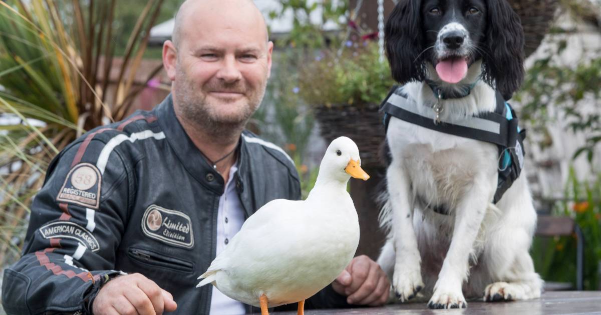 Un veterano que luchaba por su vida en coma se recupera gracias al perro que se quedó junto a su cama de hospital y al pato que lo lleva a pasear.