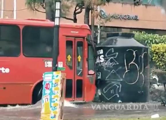 Las fuertes lluvias no solo han provocado encharcamientos e inundaciones, también algunas situaciones como que un tinaco gigante “circule” por las calles de Zapopan, Jalisco, provocando un incidente contra un camión urbano.