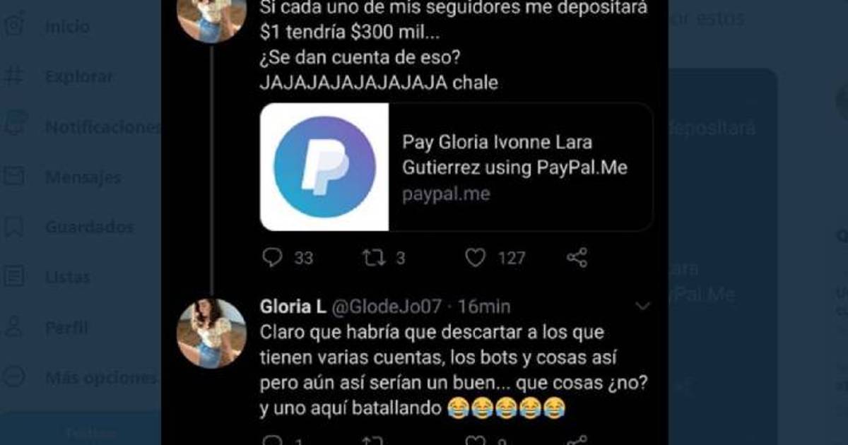 Lara escribió en su cuenta de Twitter que si cada uno de sus seguidores le depositara un peso, juntaría 300 mil pesos. Aunque todo parecía ser una broma pesada de su parte, la tuitera adjuntó una liga a una cuenta de PayPal para que sus seguidores le brindaran apoyo económico.